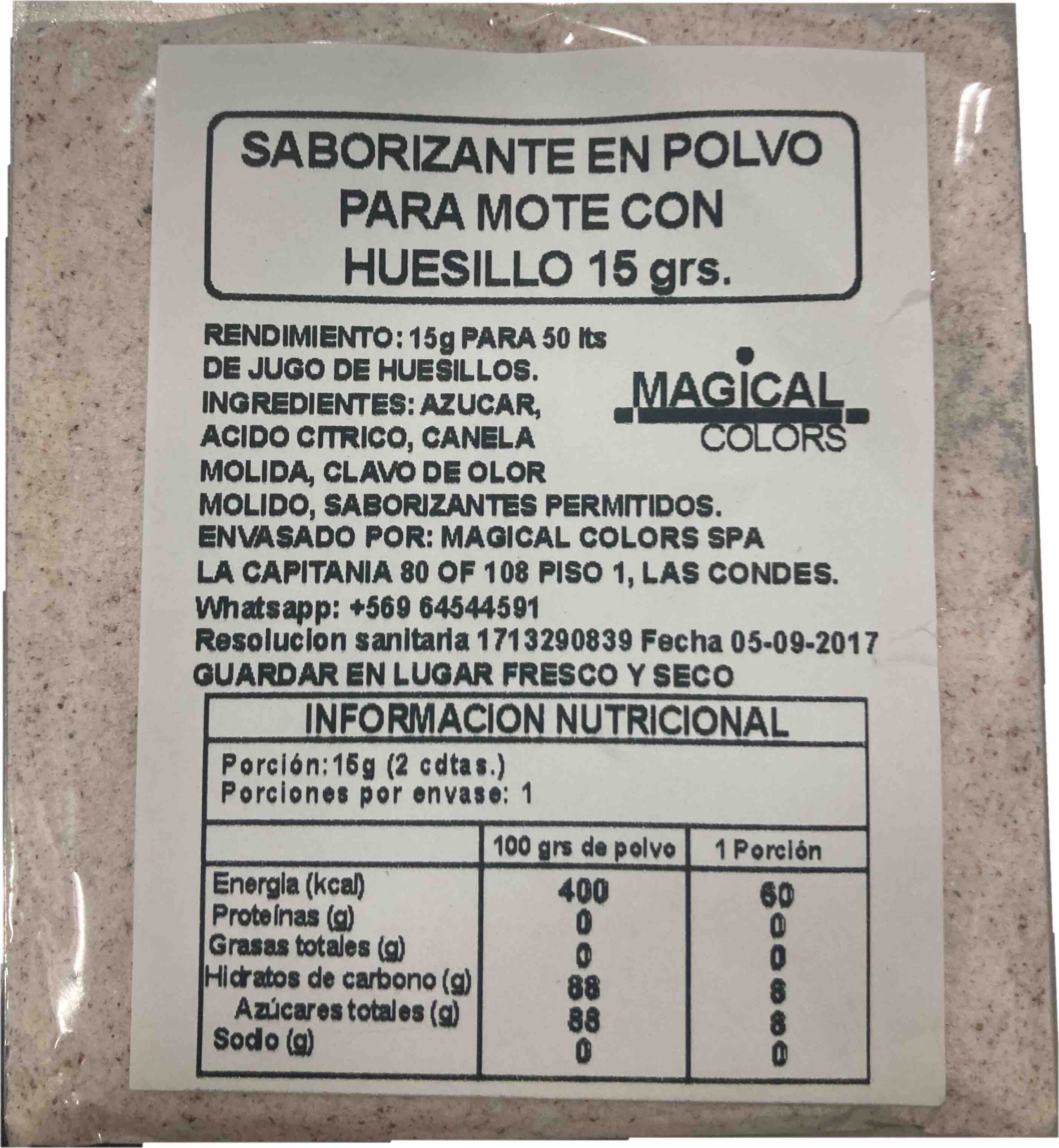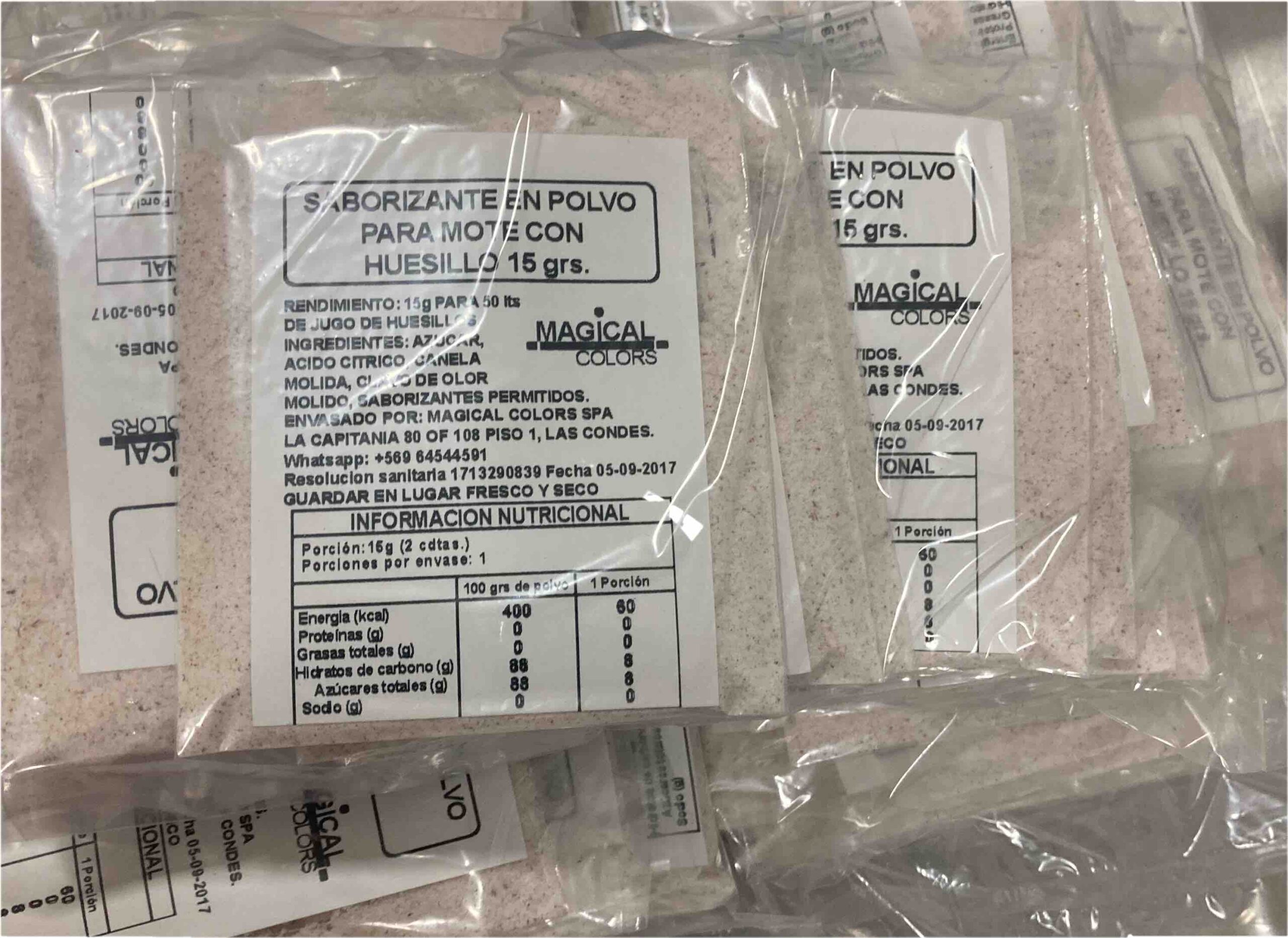 SABORIZANTE EN POLVO PARA MOTE CON HUESILLO RINDE 50 lts, CONTIENE 15g.